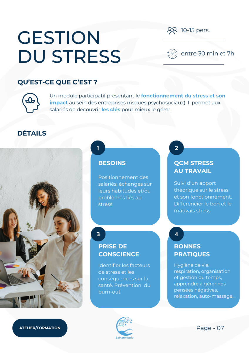 BzHarmonie est une organisation qui vous propose des outils, des ateliers, des stands et des formations pour promouvoir le bien être au travail.